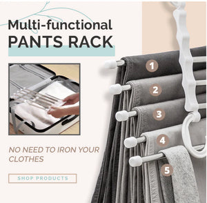 ✔ CREASE AND WRINKLE-FREE - Our 5-in-1 cloth hangers are designed not to crease your clothes. They keep your pants wrinkle-free and ready to wear!
