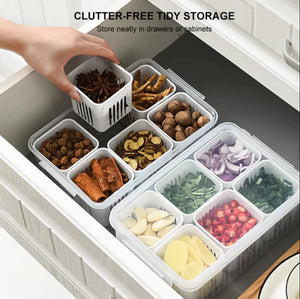Organize your Fruits, Vegetables, and Kitchen essentials effortlessly with 6 Grids Food Storage Container. Designed for convenience, this multi-purpose container keeps your ingredients fresh and within easy reach.