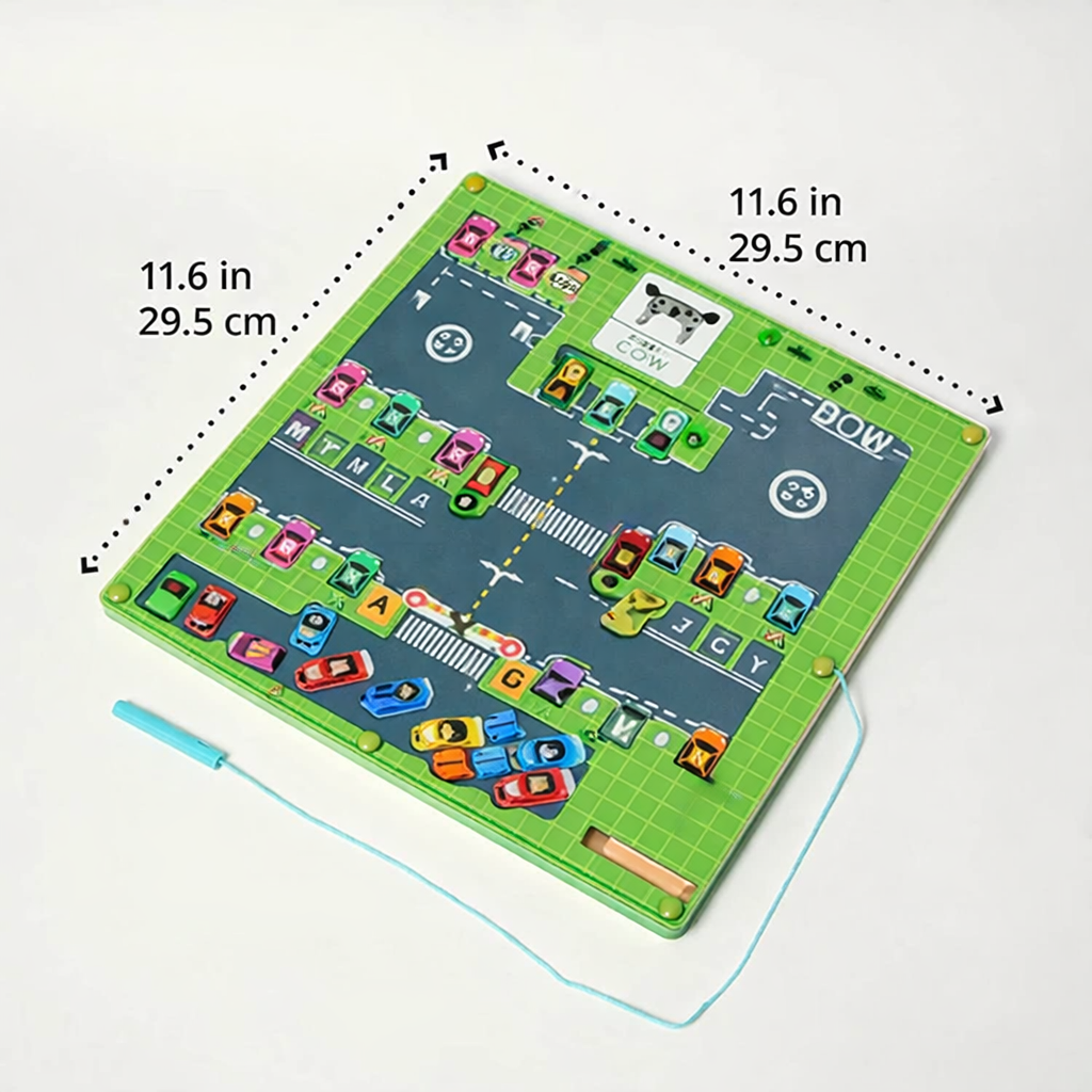 Take the magnetic pen and guide the cars to their correct spots. While doing so, your little one will learn the alphabet by connecting shapes and colors. This toy has all the interactivity of a video game but without excess screen time!